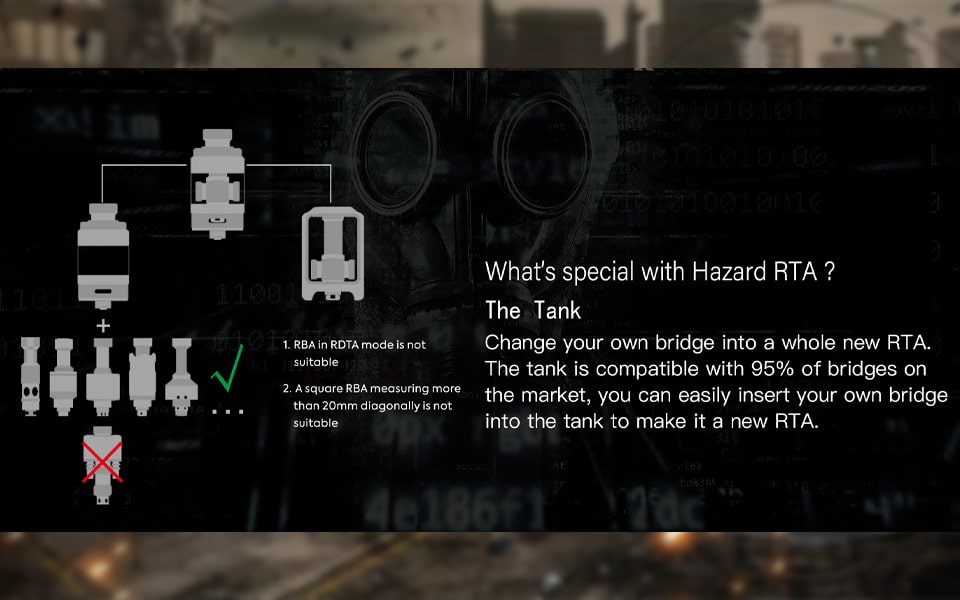 Dovpo x Across Vape Tank Hazard RTA е RTA (Rebuildable Tank Atomizer) резервоар с диаметър 24 mm и капацитет 4 ml, който е подходящ за инсталиране на единична DIY намотка. Резервоарът позволява инсталирането на всеки Billet Box RBA мост с ширина до 20 mm, а прикрепеният мост може да се използва и на други Billet Box устройства. Проектиран е със система за по-нисък въздушен поток, която също може да се регулира с включените вложки и със система за лесно пълнене на е-течности. Предлага се в цветовете сребристо и Gunmetal.
