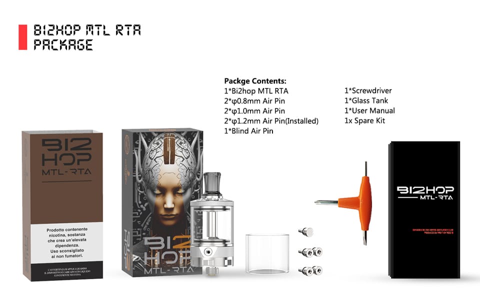 Ambition Mods Verdampfer Bi2hop MTL RTA ist ein RTA (Rebuildable Tank Atomizer) Verdampfer mit einem Durchmesser von 22 mm und einem Fassungsvermögen von 4 ml. Die Basis eignet sich für die Installation einer einzelnen Spule. Es ist mit einem unteren Luftstromsystem ausgestattet, das mit den mitgelieferten Einsätzen einfach reguliert werden kann. Es ist in den Farbkombinationen Silver und Black erhältlich.
