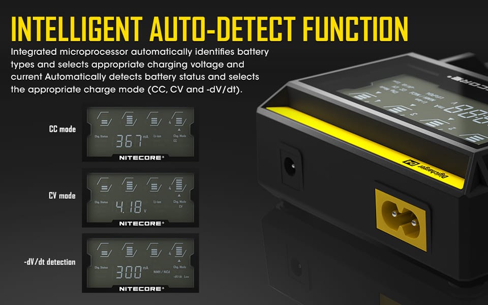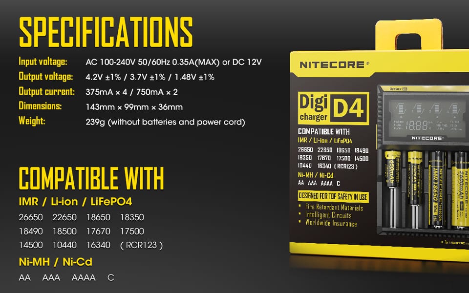 Nitecore Ladegerät D4 ist ein universelles Smart-Ladegerät, das mit fast allen wiederaufladbaren zylindrischen Batterien kompatibel ist. Der D4 erkennt automatisch Li-Ionen-, Ni-MH- und Ni-Cd-Akkus durch manuelle Anpassung und kann auch zum Laden von LiFePO4-Akkus eingestellt werden. Außerdem können Sie dank seiner Form vier Batterien gleichzeitig aufladen.
