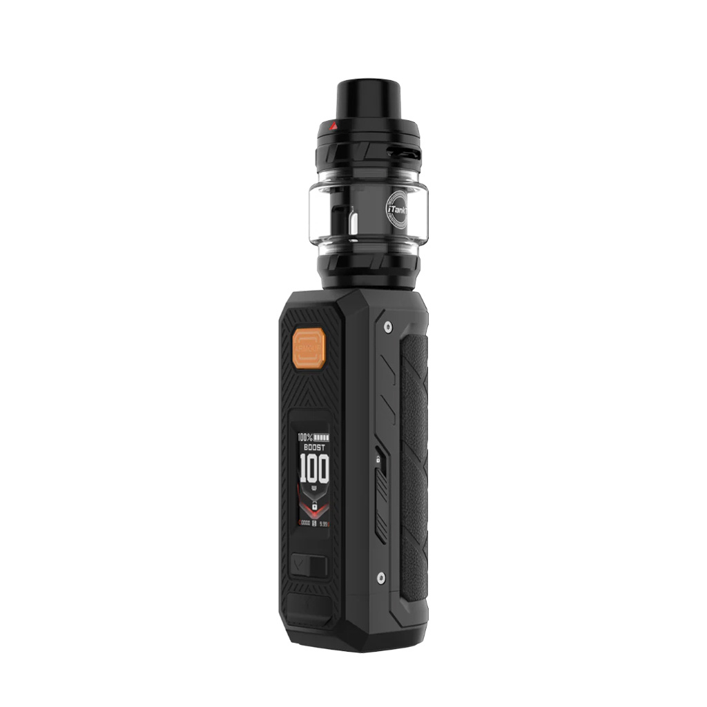 The Vaporesso Armour ULTRA is a kit with a maximum output of 100W and a built-in Axon chip that supports multiple modes: Boost, Pulse, ECO, Temperature Control (TC), and Smart. The Armour ULTRA features a 0.96″ TFT display and is powered by a built-in 5500mAh battery. The device is certified to IP68, IP69K, and MIL-STD-810H standards, ensuring water resistance, dust protection, and shock and drop resistance up to 1.2 meters. It comes with the iTank T tank, which has a capacity of 6ml and a diameter of 24.5mm. It uses replaceable GTI coilheads. The Armour ULTRA is available in color combinations Obsidian Black, Camo Silver, and Emerald Green.